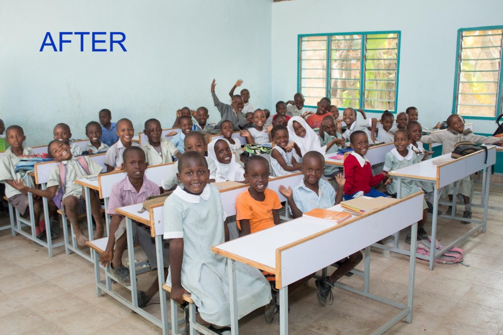 During the recent school holidays all classrooms were refurbished thanks to a generous donation from a local Mombasa company. All classes have been repainted, six are now fully tiled and four have new desks. The transformation is amazing!