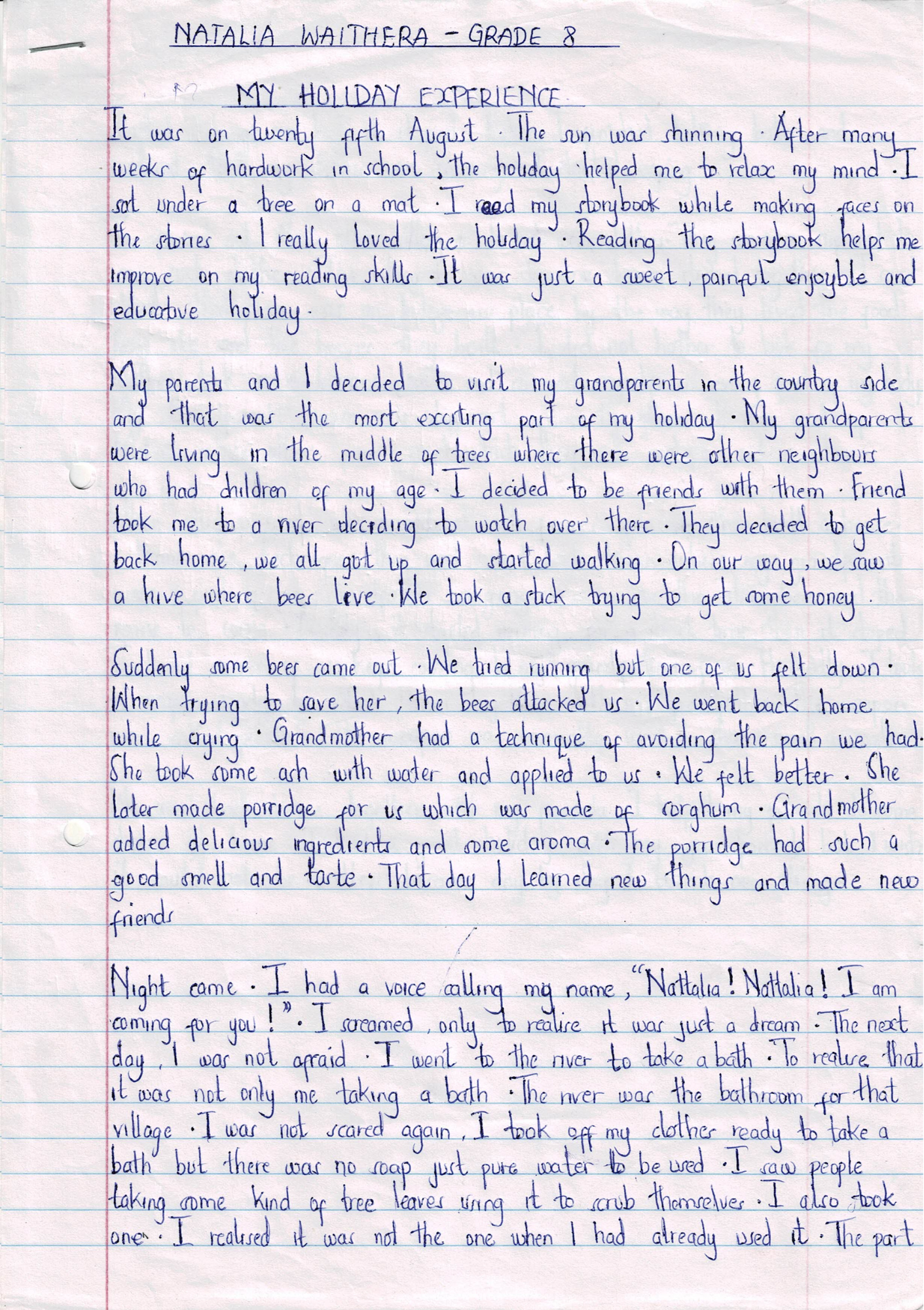 Natalia, our adventurous Grade 8 student, spent her break reading storybooks under a shady tree, visiting her grandparents, and making new friends. Her holiday was full of excitement, even including a surprise chase from bees while collecting honey! She also bathed in the river with local indigenous people, learning about their lifestyle and gaining unforgettable experiences.