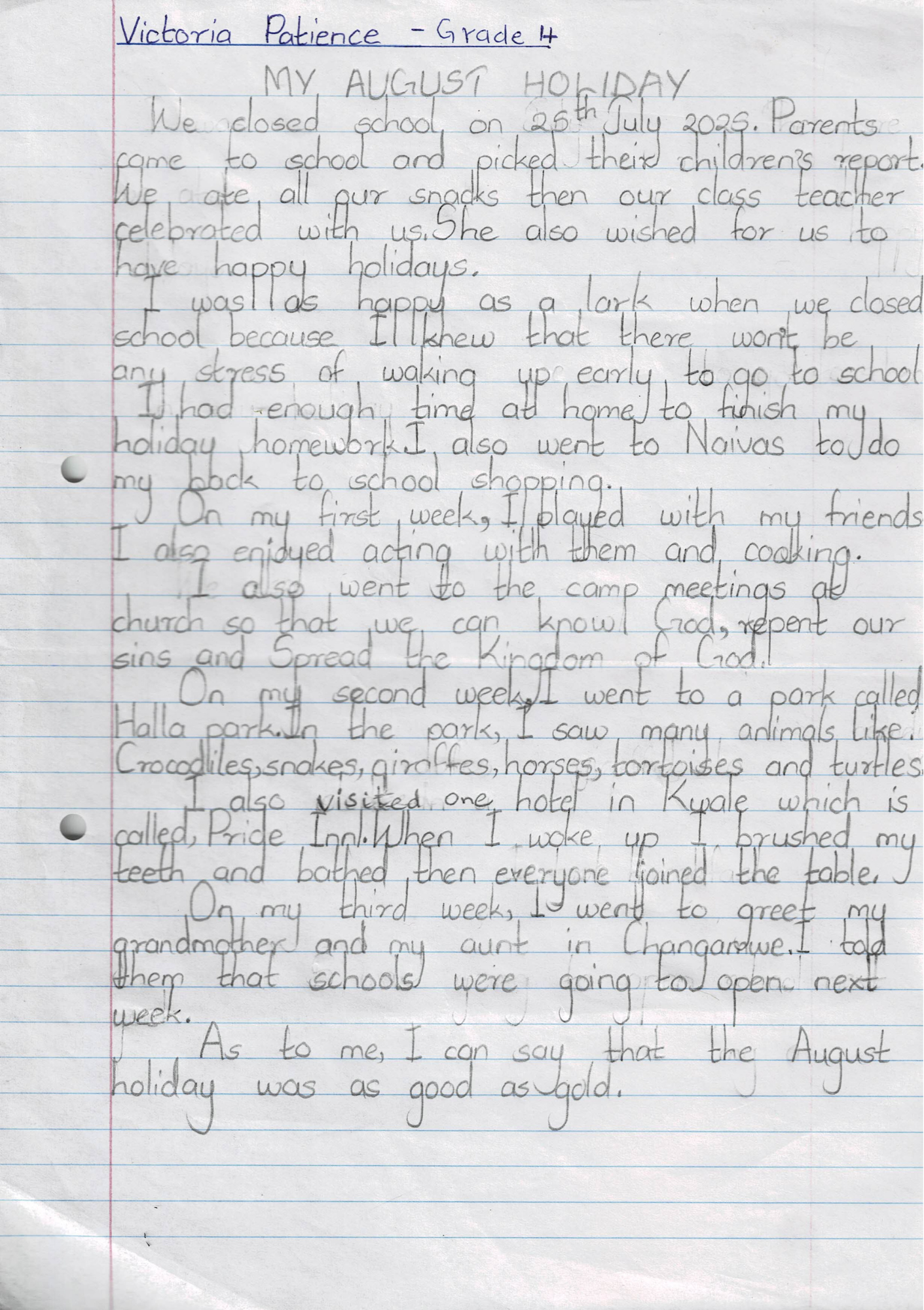 Victoria, one of our bright Grade 4 students, enjoyed an exciting visit to Holla Park where she saw crocodiles, giraffes, and turtles. She also spent quality time with her grandmother and aunt in Changamwe, played with friends, and kept up with her homework, all while enjoying a break from early morning wake-ups!